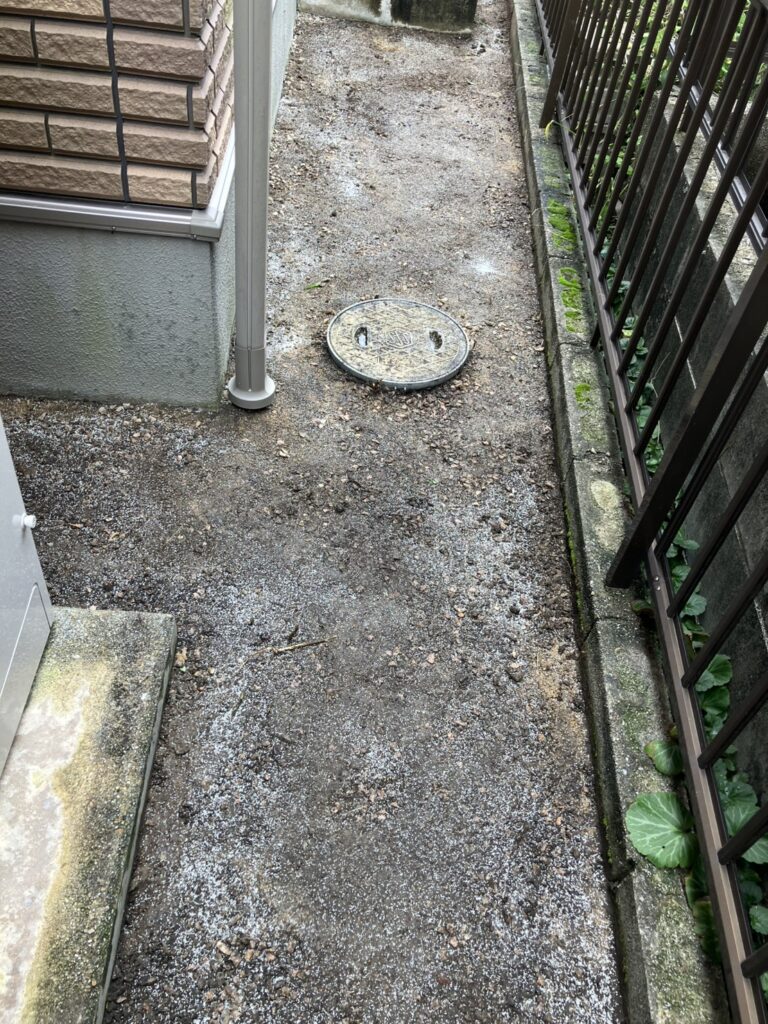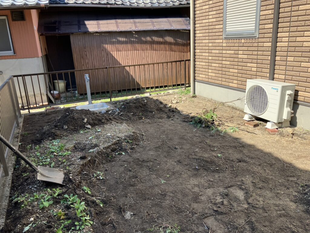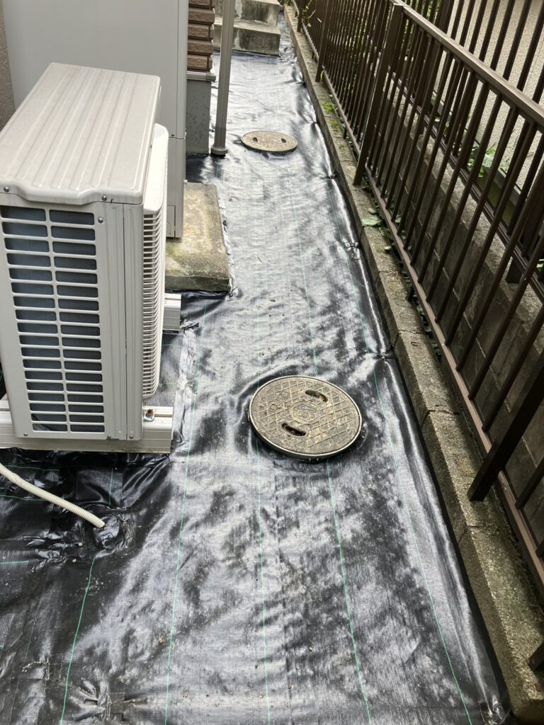 裏面ですが、草を除去、除草剤を撒いてから防草シートを張ります。